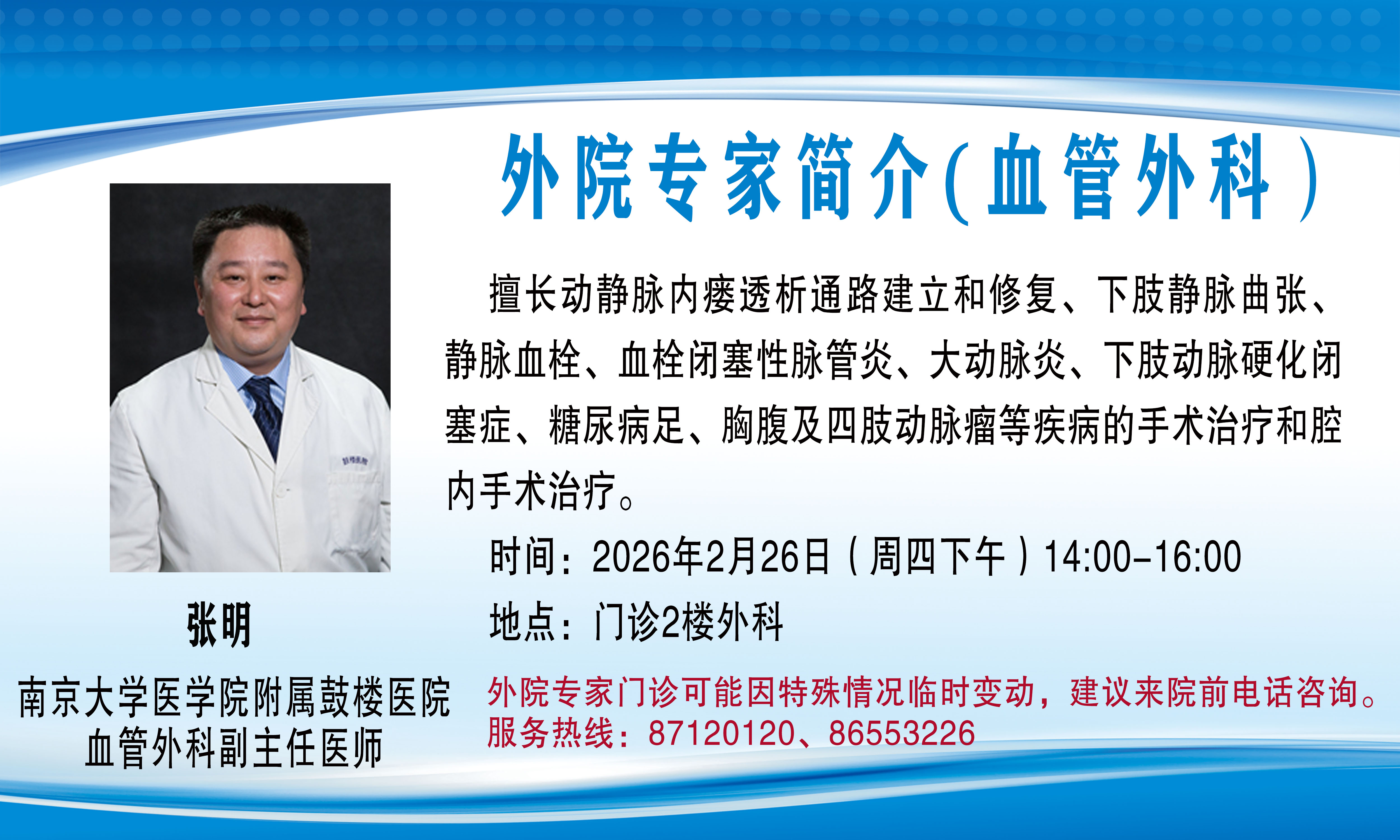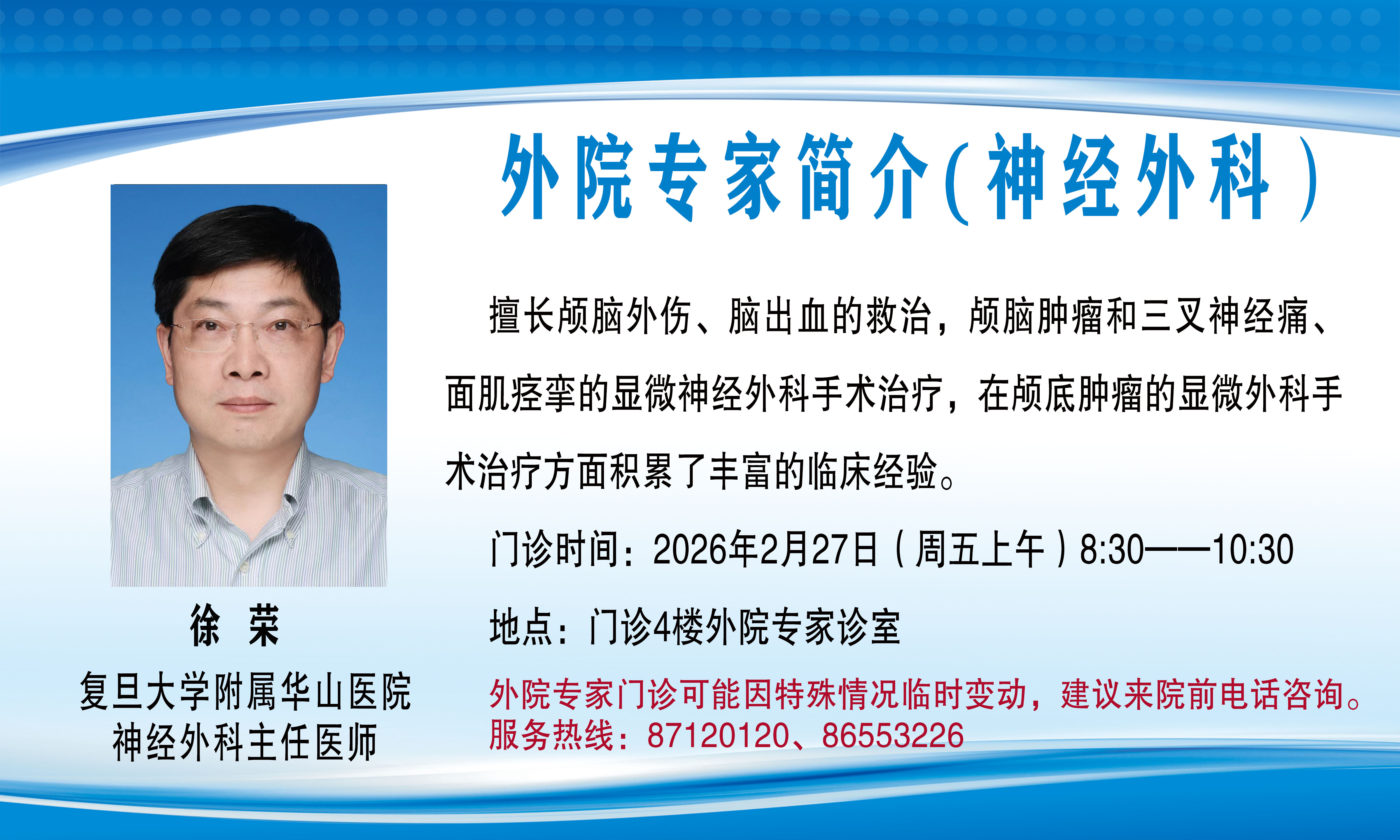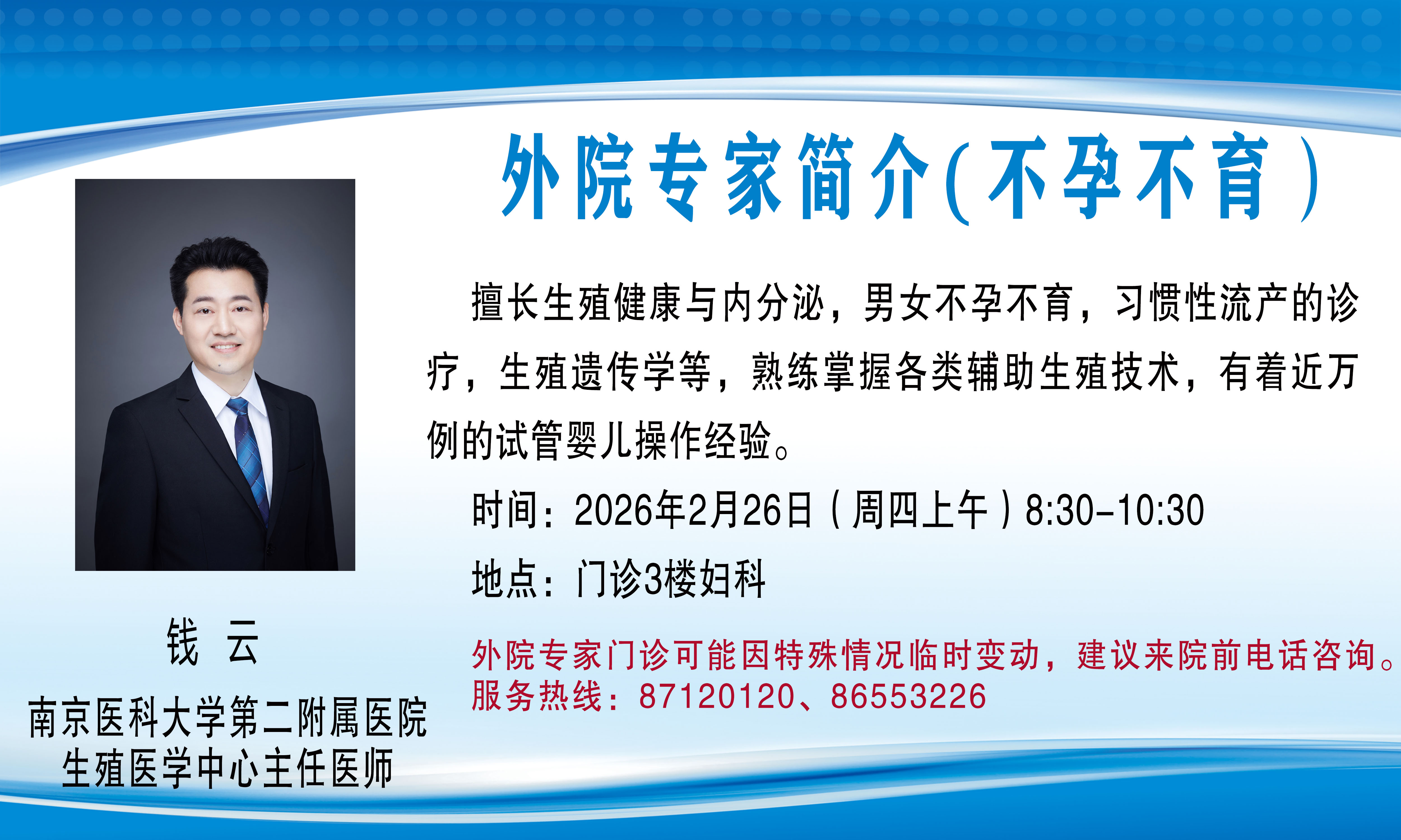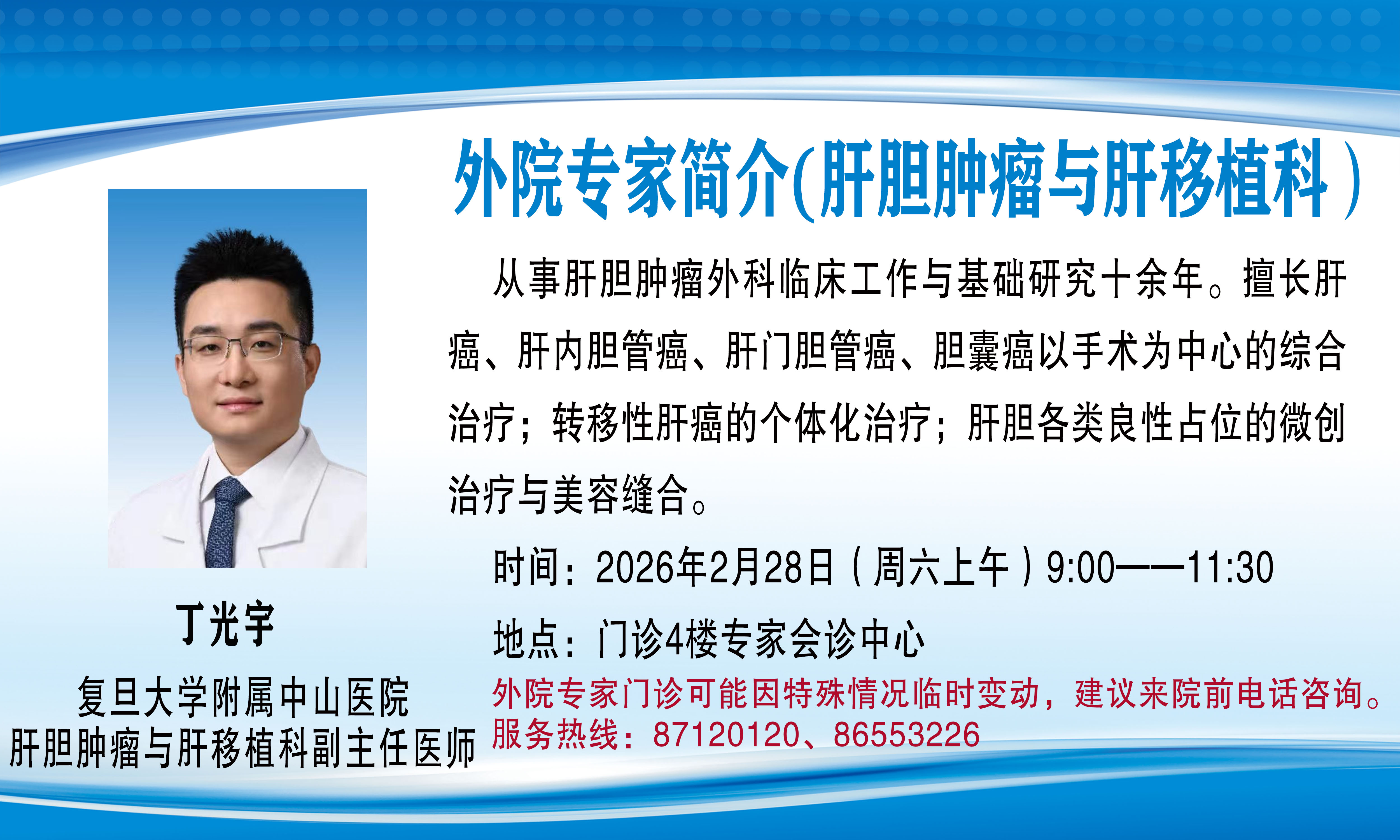 外院专家门诊(会诊)可能因特殊情况临时变动,建议来院前电话咨询,服务热线:87120120、86553226。