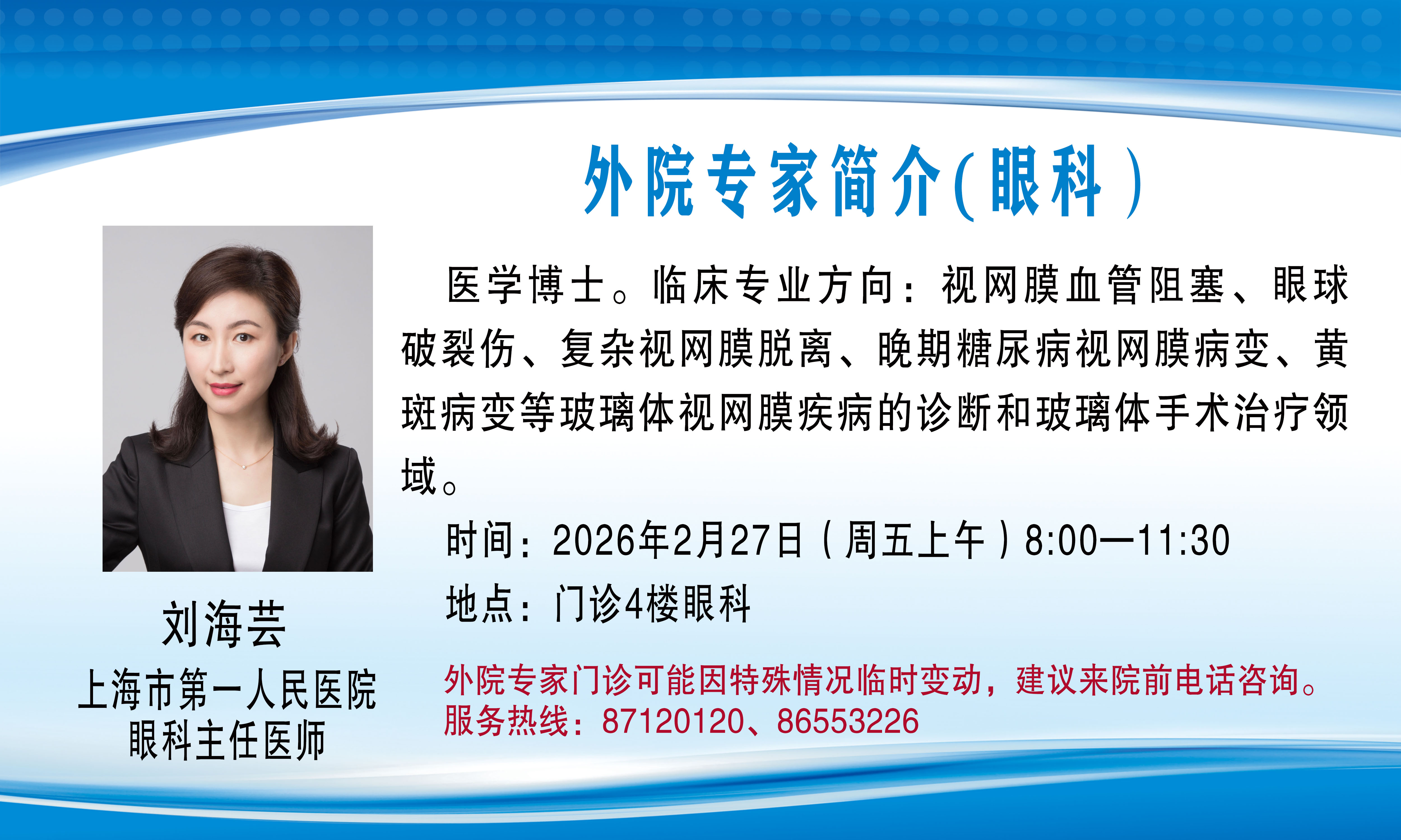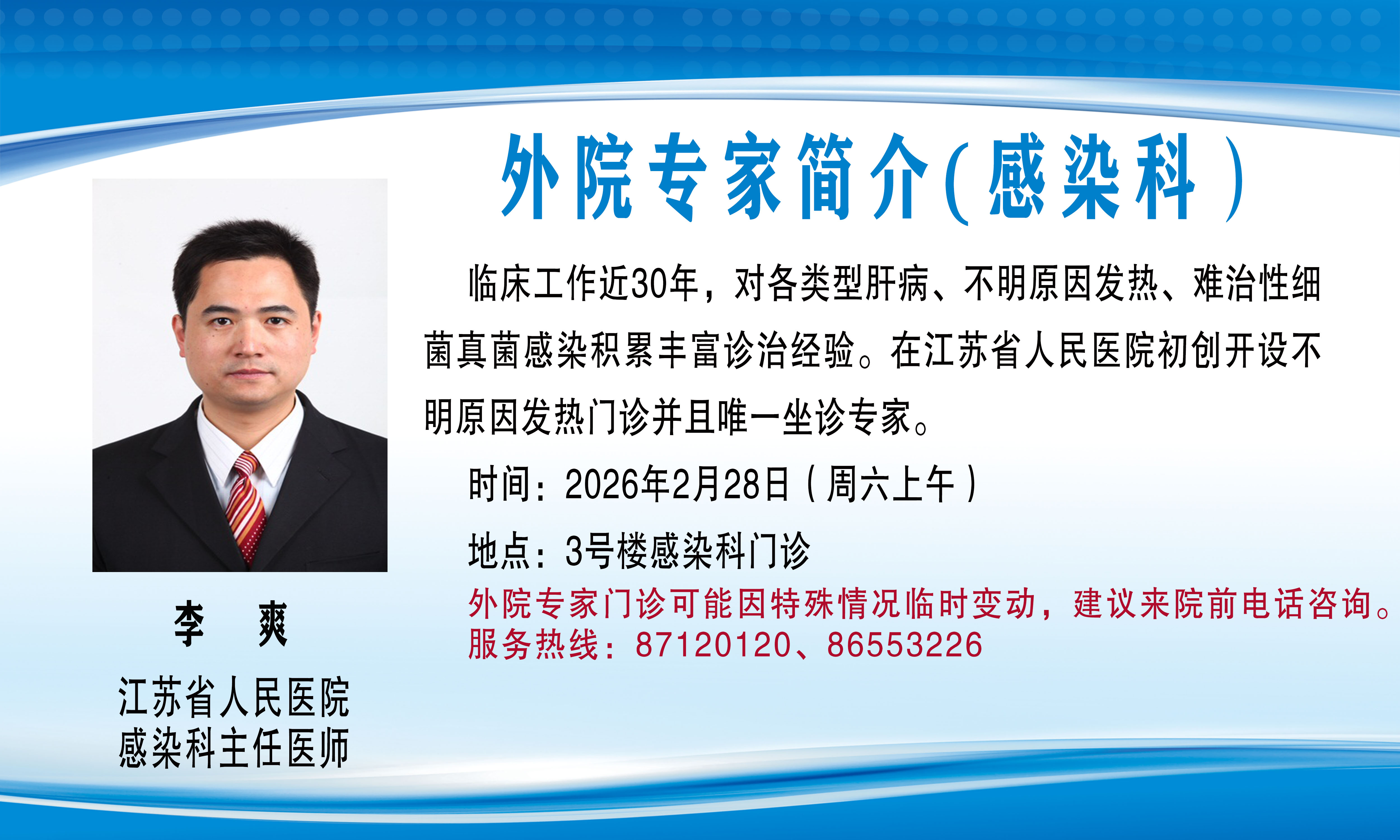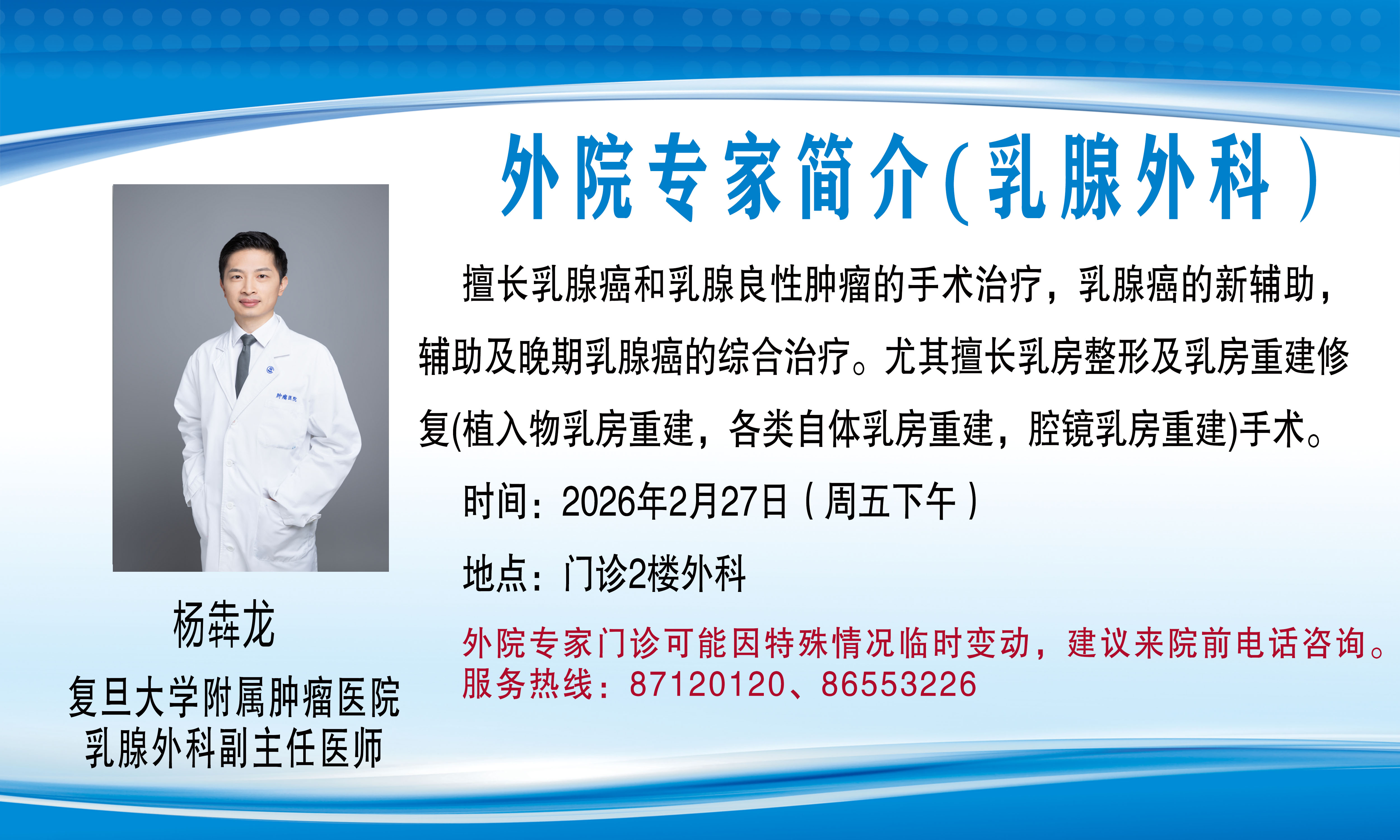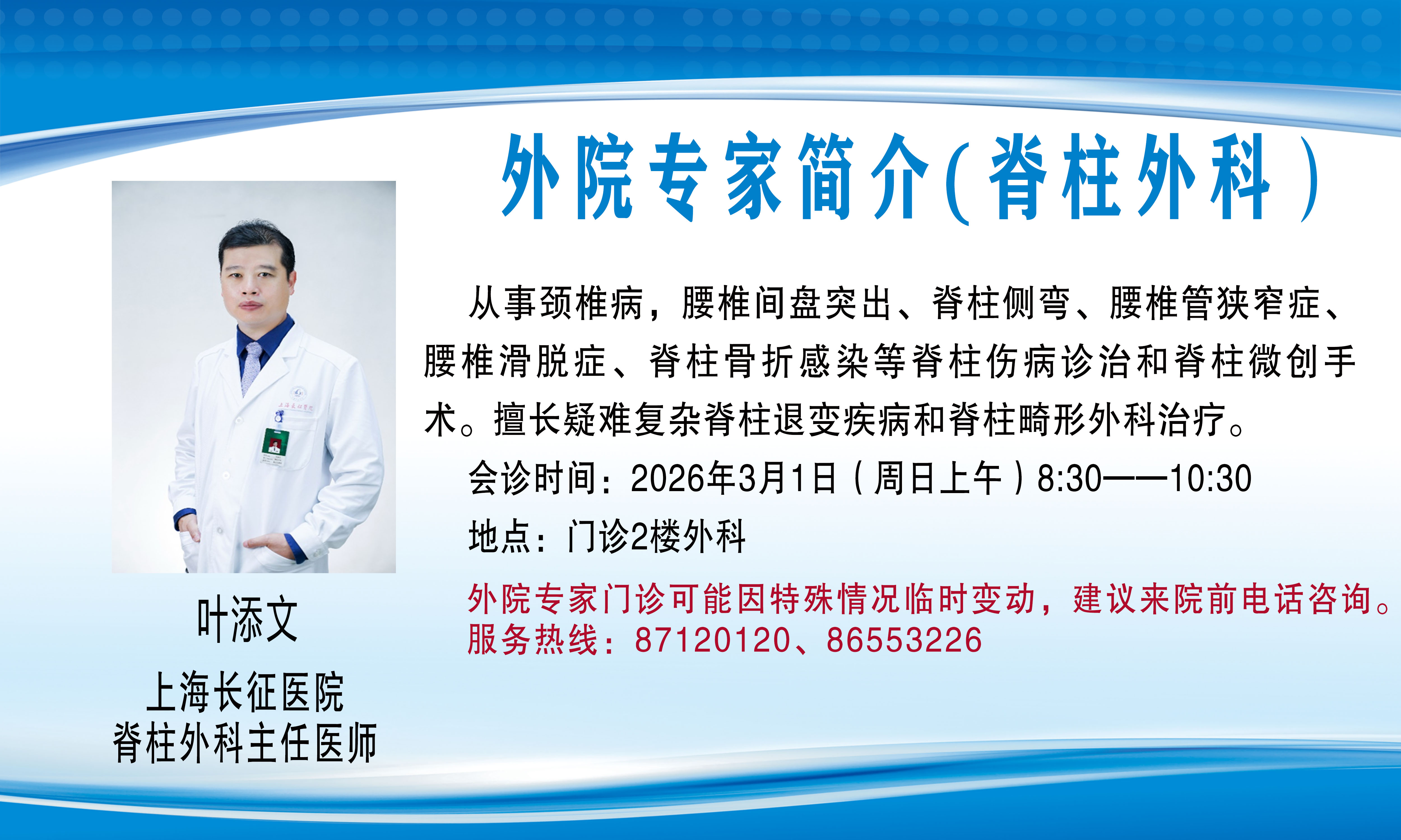 外院专家门诊(会诊)可能因特殊情况临时变动,建议来院前电话咨询,服务热线:87120120、86553226。