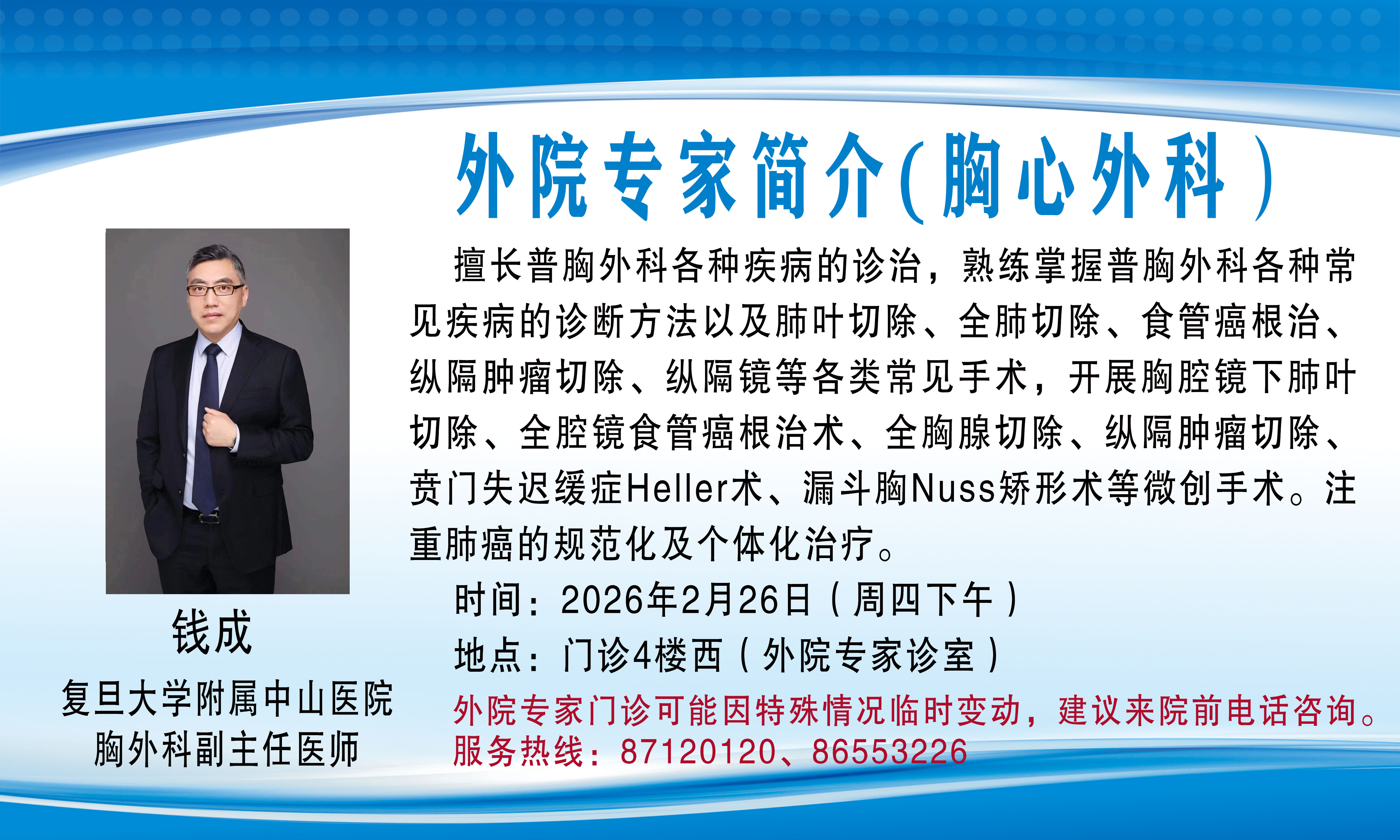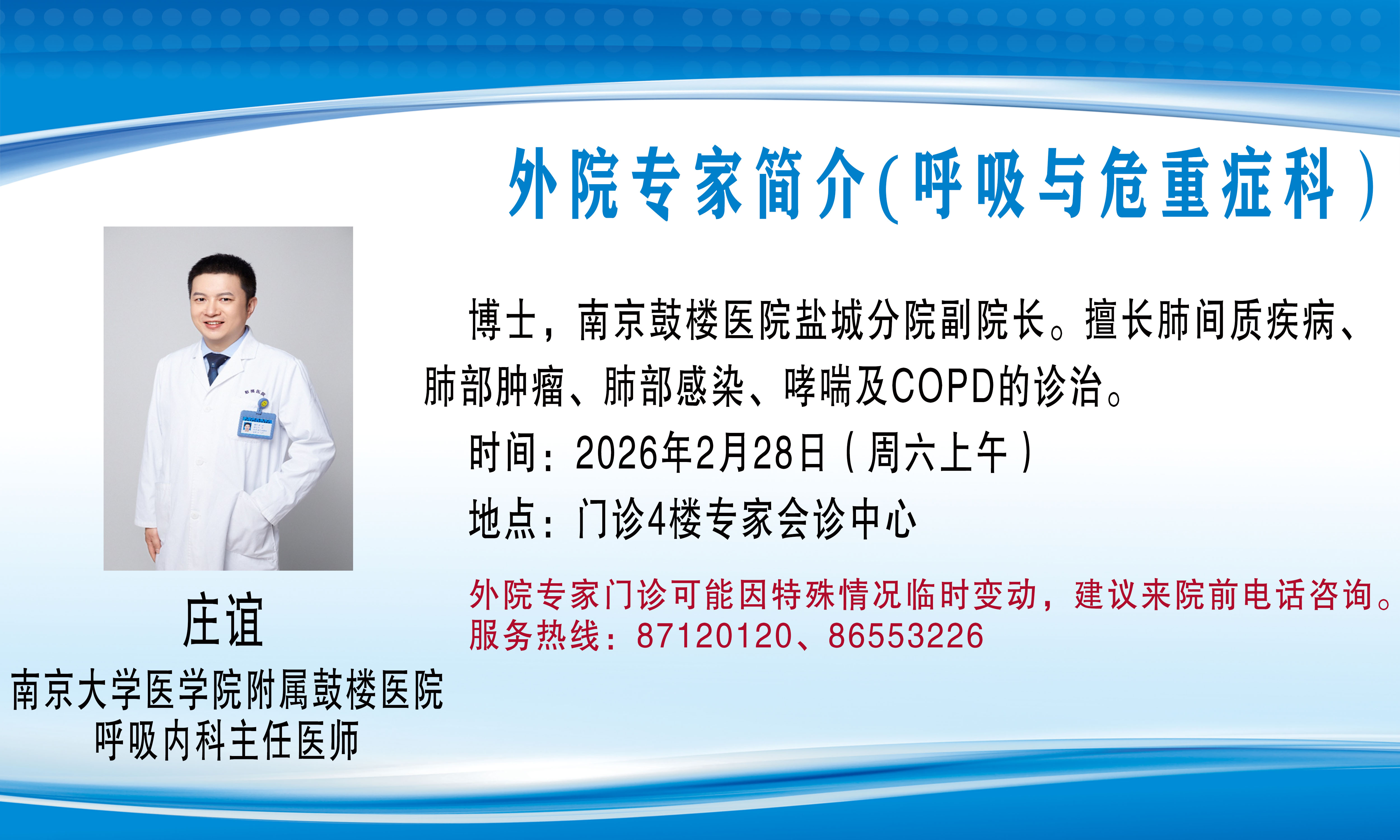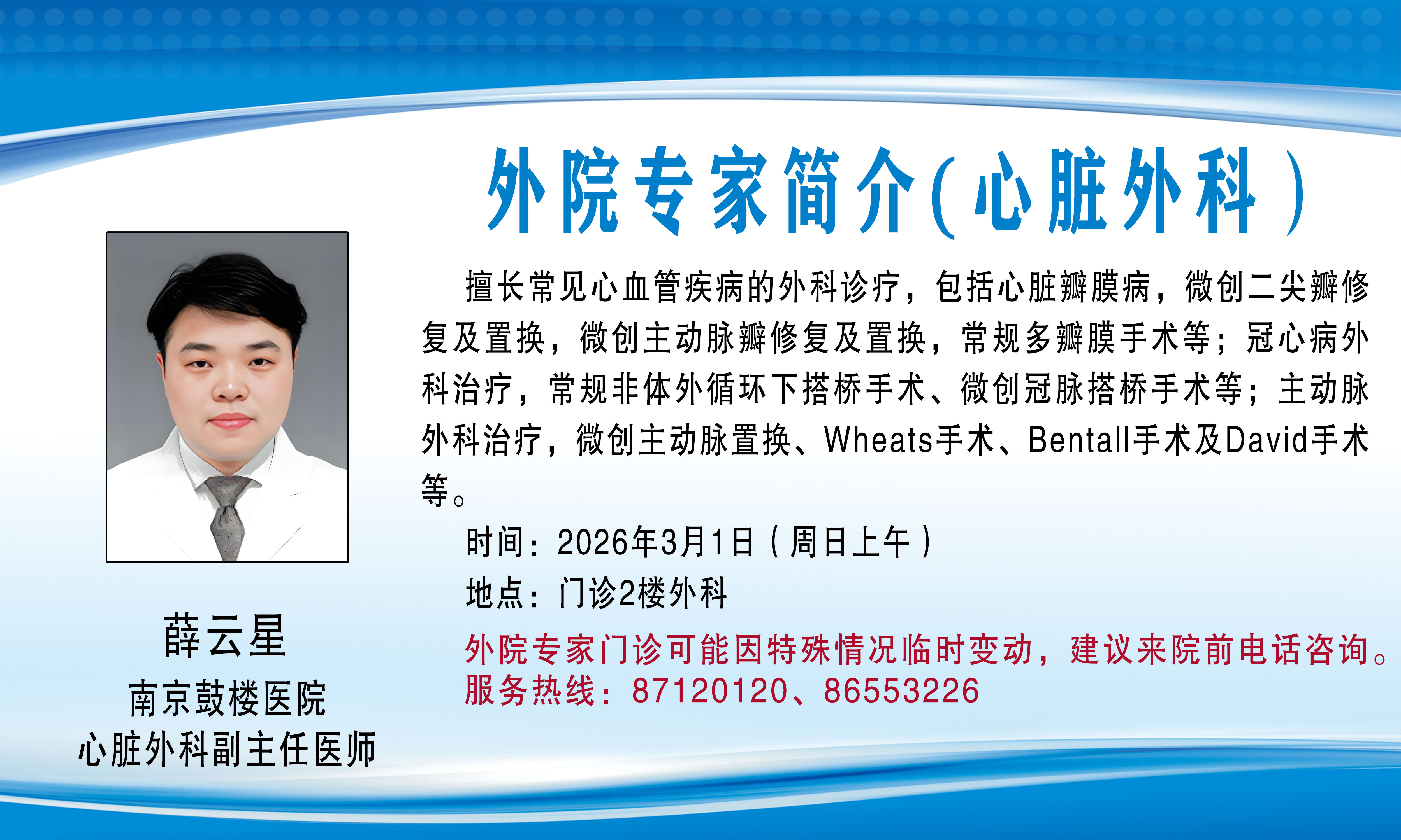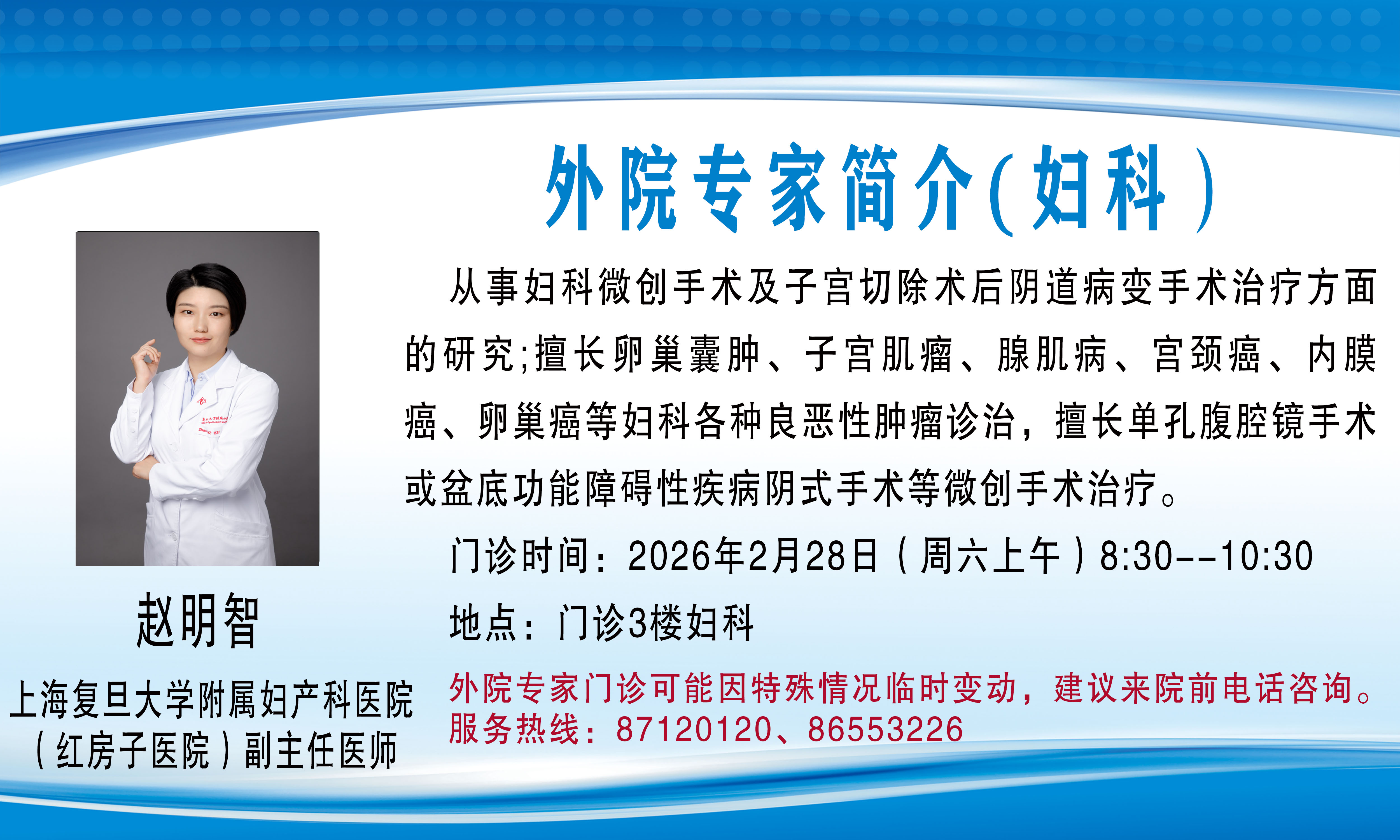 外院专家门诊(会诊)可能因特殊情况临时变动,建议来院前电话咨询,服务热线:87120120、86553226。